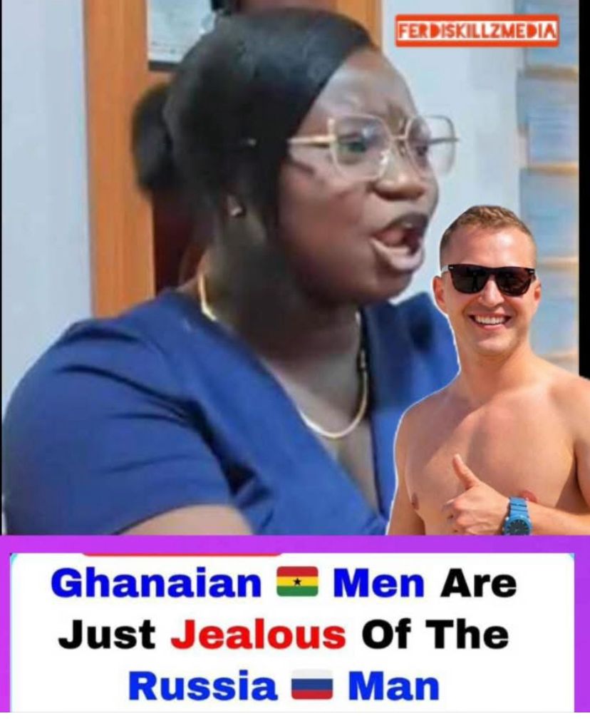 The viral image includes a prominent caption suggesting that Ghanaian men are “jealous” of a Russian man. The framing implies a comparison between local Ghanaian men and a foreign suitor, sparking immediate reactions from viewers who interpreted the message in different ways.
